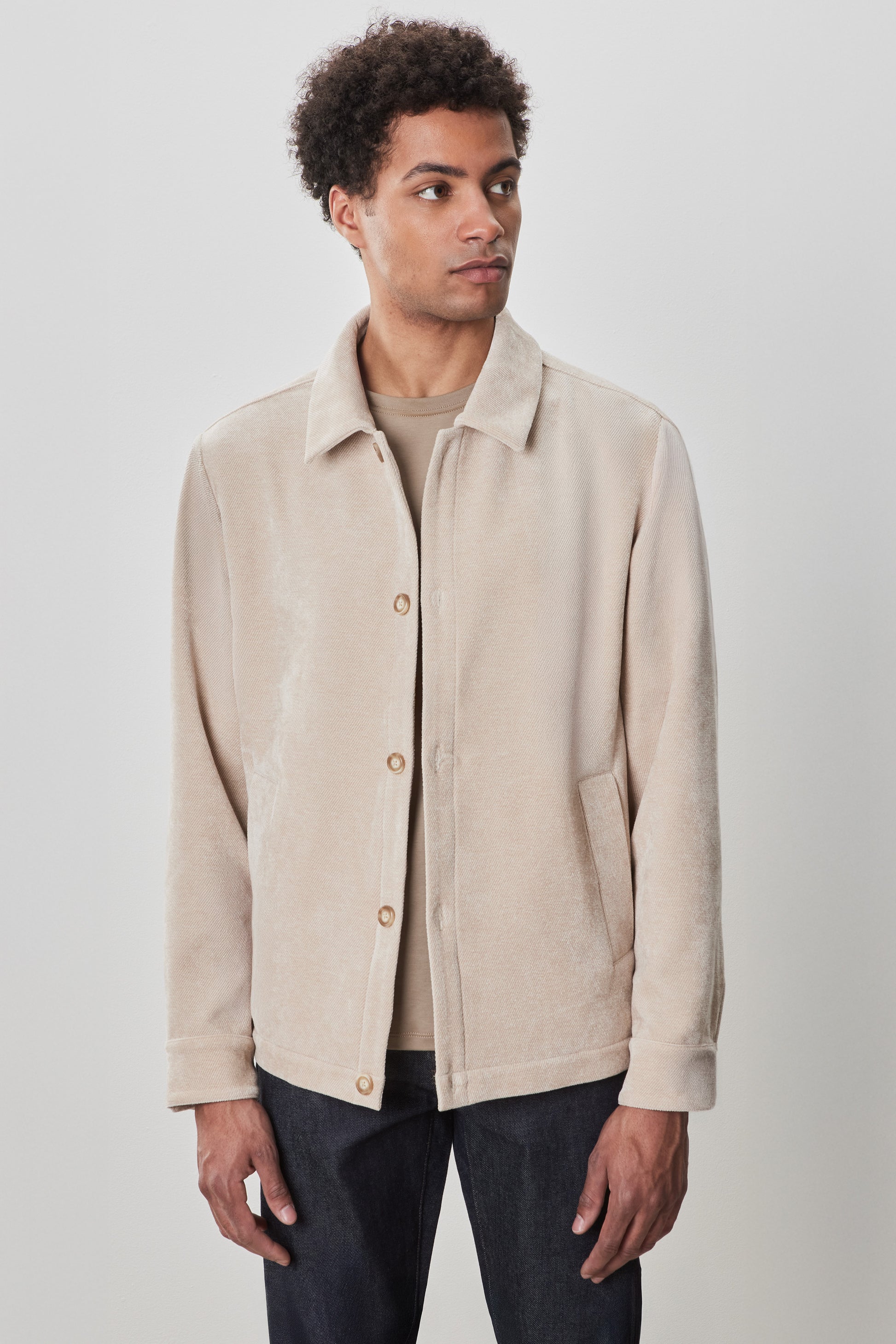 Crafted from an ultra-soft, drapey fabric, this overshirt delivers a luxurious feel with effortless style. The textured twill design adds depth and sophistication, while larger buttons and practical side pockets enhance its appeal as the perfect layering piece. Refined yet relaxed—ideal for dressing up or down.